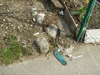 The sole, however, was not meant to be forgotten because a couple of weeks later I went to go for a walk and discovered somehow the sole had found its way to a very noticeable spot on the adjoining front sidewalk. Many people walk that sidewalk each day but no one bothered the sole and neither did I other than a fleeting wonder at how it got there and a thought that I suppose I better do something with it.....but later.